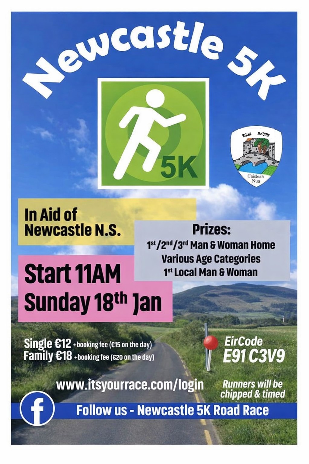 The Newcastle 5k in aid of the local school takes place on Sunday 18th January at 11am. Over the years this event has grown in stature as many athletes see it as an ideal opportunity to test their fitness at the start of the year. All funds raised by this event will go to our local National School, Scoil Mhuire, as such there is a great local level of participation. Fabulous refreshments in hall after race.